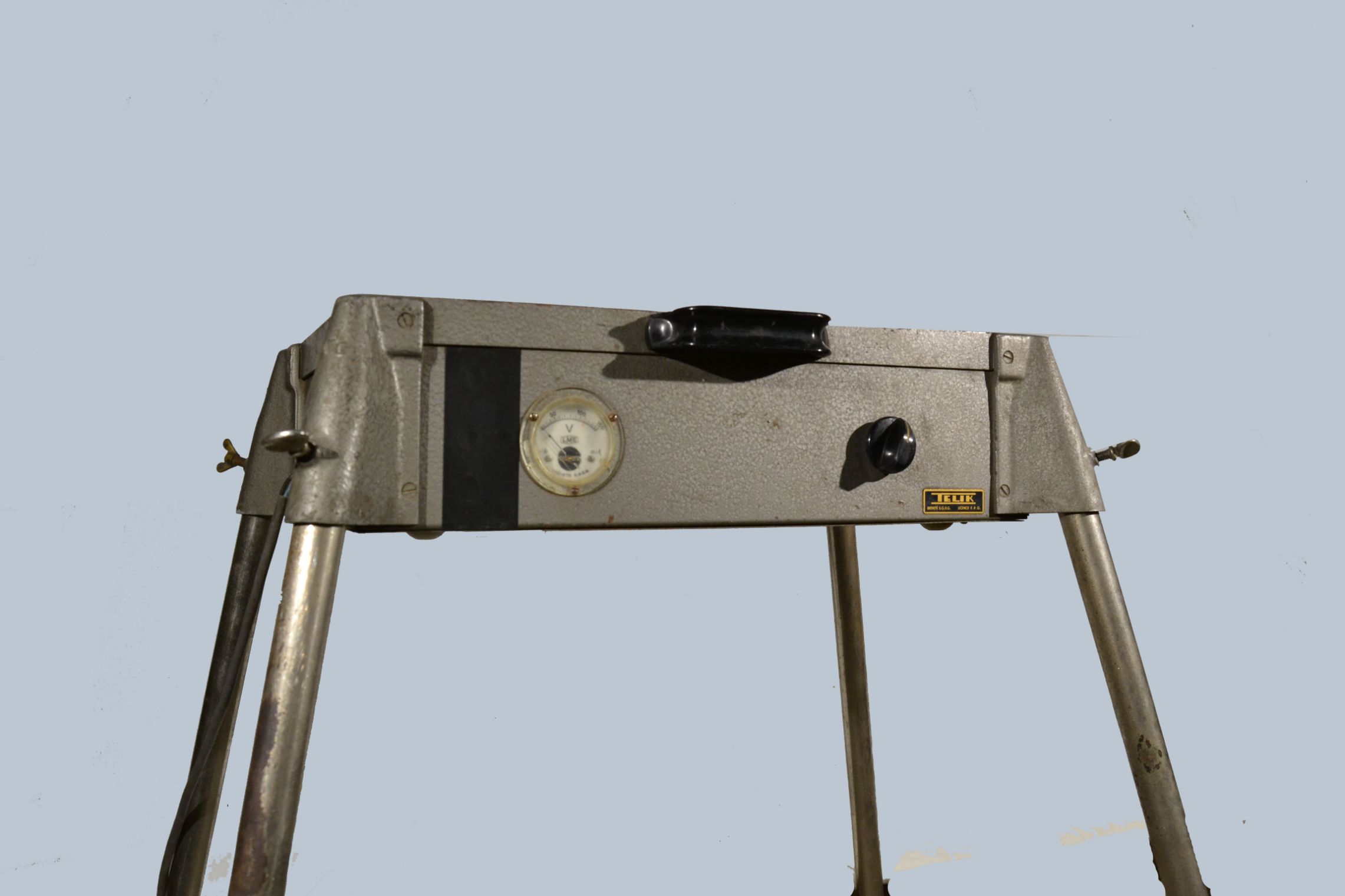 Equipée de 4 pieds amovibles, elle supporte le projecteur et l'amplificateur et permet la transformation du courant 220 à 240 volts en 110 volts afin d'alimenter la lampe de projection de 1000 W. Un sélecteur rotatif sert à ajuster la tension de sortie du transformateur avec l'aide d'un voltmètre à cadran.