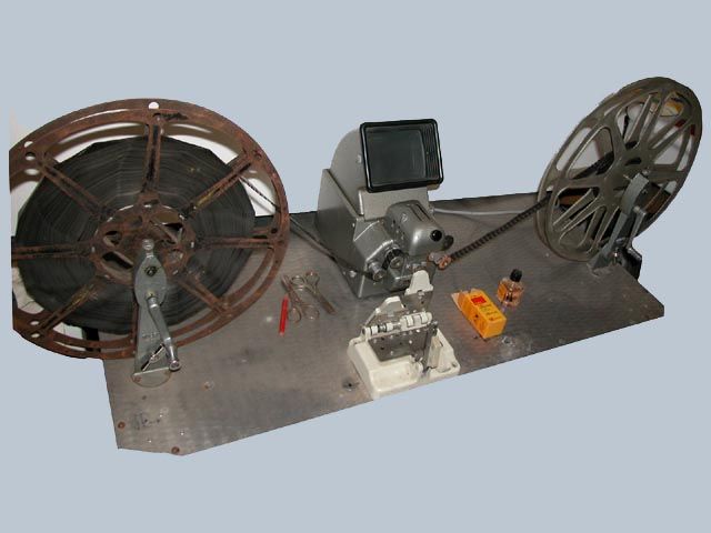 Visionneuse amateur années 1960. Le film est guidé par quatre galets sur une fenêtre de projection. Un galet à dents au pas de 16mm entraîne un pignon équipé d'une lame parallèle servant d'obturateur. La lumière est produite par une lampe basse tension à filament droit focalisée par un petit condenseur,qui passe par la fenêtre, puis traverse la lame parallèle, la lentille de mise au point et est renvoyée sur un écran dépoli grâce à deux miroirs.