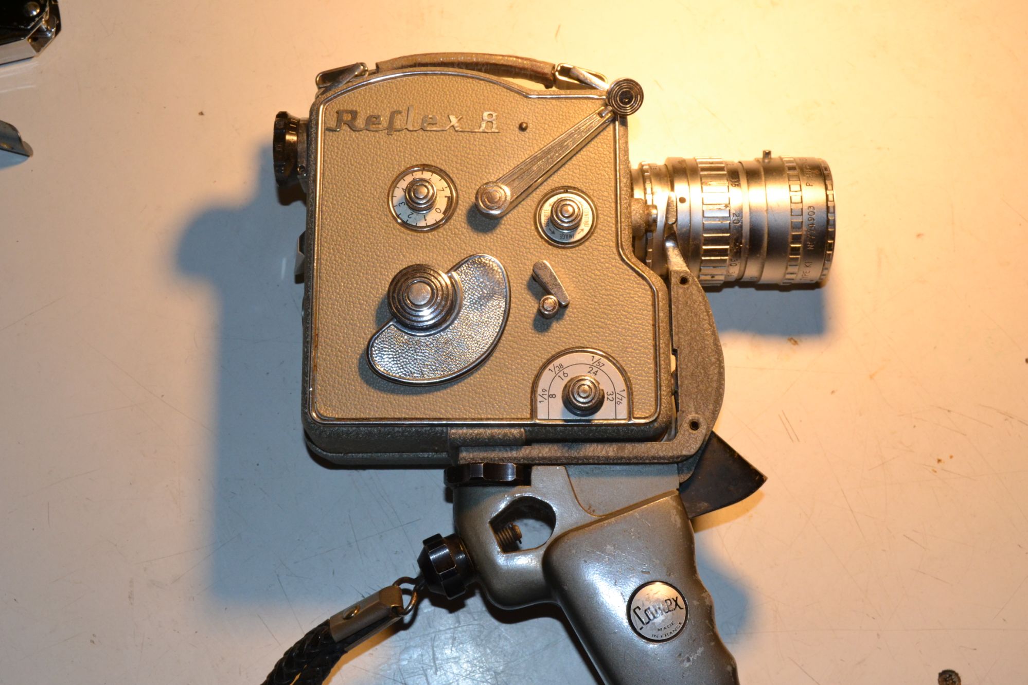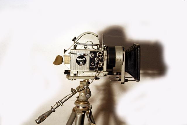 Ce modèle 16mm AT de 1960 est équipée d'un compendium porte filtre. Elle reçoit des bobines de 30m et peut recevoir un chargeur extérieur de 120m. La tourelle reçoit trois objectifs Som Berthiot, un télé de 75 1:3.5, un normal de 25 1:1.9 et un grand angle de 10 1:1.9.